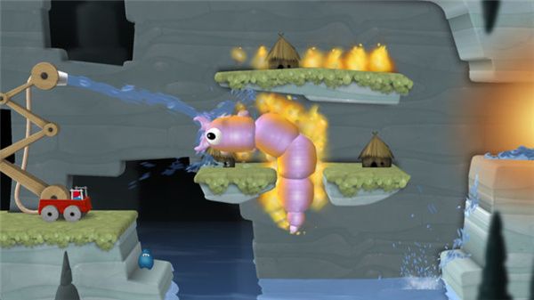 2、被引燃的地方往往不是那么好用水喷中,通常都会被平台岩石冰块等障碍物阻挡,玩家需要利用水的冲力,推力甚至是借助场景中的机关道具来将水送到火苗所在的地方。