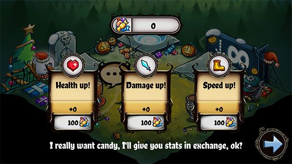 1、收集怪物们撒下的糖果,当小恶魔们死了的时候,你可以可以用它升级你的等级,或者用它们来进阶你的游戏等级