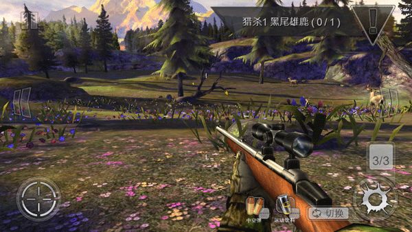 6、先打距离最近的,这样威力大,瞄的准。点击左边的准星键,切换到望远镜模式,在望远镜模式下,可以通过触摸操作来放大倍率,最大倍率为4倍。然后选择红外线拍摄,即可看到猎物的肺部,瞄准肺部射出子弹。选择交换可以切换武器。