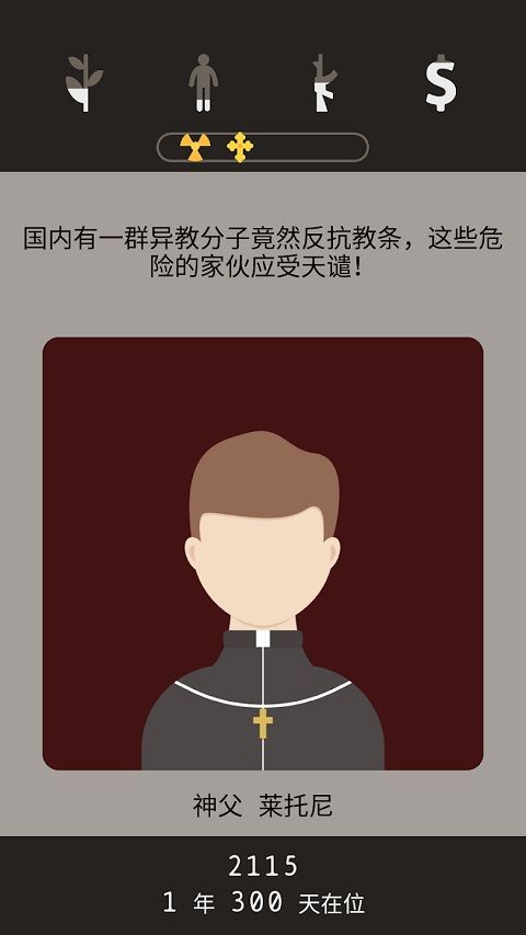 3、玩法内容,各种可能会影响到国家生存的事件,玩家需要随机应变,尽可能的帮助国家长久的生存下去。