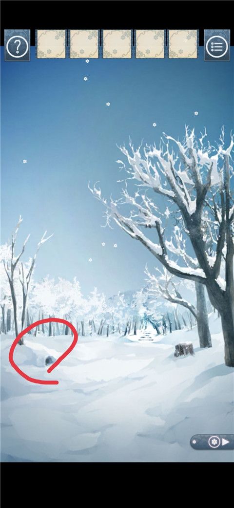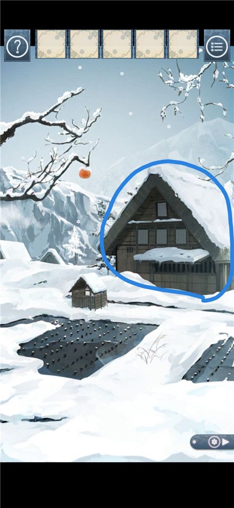 1、剧情ing 开局发现地上和树上都有黄色的东西,捡起来地上发现是果实(图片黄色区域),树上的就是我们需要的叶子,但是够不到,这时候点旁边蓝色区域的小房子,发现被雪盖住,要一层层的点掉