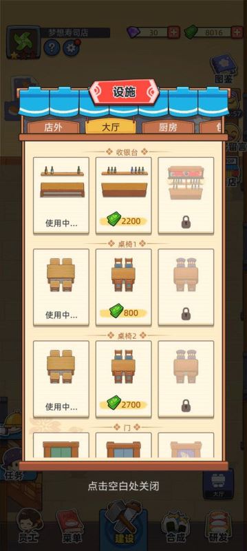 1、你突然接手以及奶奶留给你的一间看上去有些破旧的寿司店,你需要去仔细的打扫,装修,让这个店运行起来