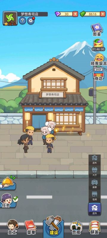 其次,在玩法方面还主打模拟、经营、招募、制作等多种元素一体,因此小伙伴不但可扮演成寿司店老板的角色与员工小野凉一起共同经营,并在游戏中完成开发各种日料菜品,制定日常采购计划,服务顾客,培训厨师和服务员,购买餐厅用品,开连锁店等一系列的操作,制作出不同的食物来满足顾客的一切需求,赚取更多的资金收益,解锁更多的食材资源,为你的每一位顾客带来幸福感,从而打造属于你的高人气寿司店铺。