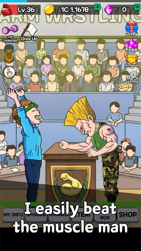 1、通过训练发展力量和耐力,在与各种对手的摔跤比赛中获胜,成为世界上最好的摔跤王!