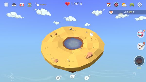 玩家只要在屏幕上随意点击就可以获得爱心,爱心是游戏中一切创造的基础。另外点击右下角的圆形按钮可以在短时间内自动获得少量爱心。点击左上角菜单按钮可以打开创造界面,在这里可以通过消耗一定爱心,给绿洲提升等级,达到一定等级即可解锁一些动物和植物,让绿洲变得更丰富。