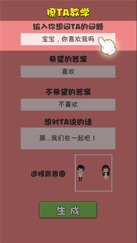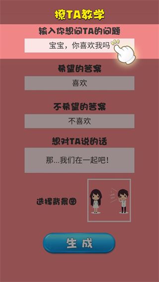 不准拒绝我手机版是一款非常浪漫的文字挑战游戏。简单的操作,丰富的剧情故事,游戏玩法高度自由,不受任何限制,非常适合情侣之间的互动。现在谈恋爱基本上都是两个人抱着手机,各自玩各自的,这款游戏就非常的有趣。玩家可以设置各种问题,每个问题都有两个选择,是或者否,当你设置好你想问的问题生成之后,将手机给你喜欢的那个人,无论怎样都按不到否这个按钮,否这个按钮还是非常调皮的,我跑、我再跑。多样化的选择丝毫不会因为你所提出的问题而尴尬,快来通过这款游戏提出平常所不敢问的问题吧。单身狗还可以通过该款游戏去和心爱的ta告白哦。