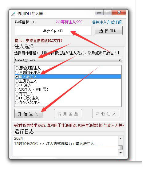 2.打开通用DLL注入器 V1.0注入器 共四步选择辅打包的辅助DLL目标飞车进程GameApp.exe