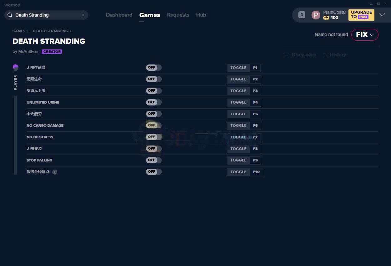 死亡搁浅十项修改器(不会疲劳/无限资源) v1.0 MrAntiFun版