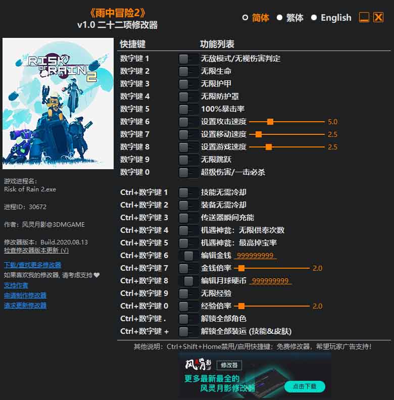 雨中冒险2二十二项修改器(超级伤害/一击必杀/经验倍率) v1.0 免费版