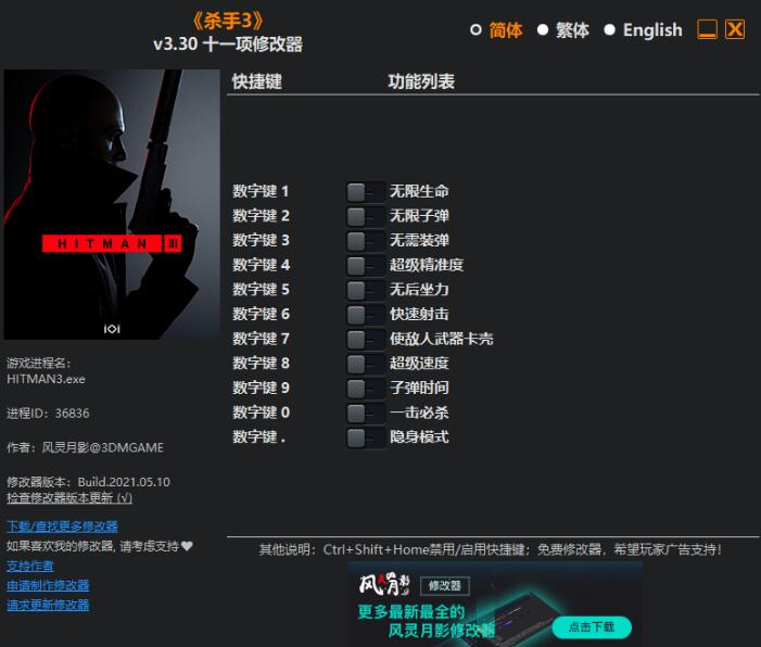 杀手3十一项修改器(无限生命/无限子弹/一击必杀) v3.10-v3.30 风灵月影