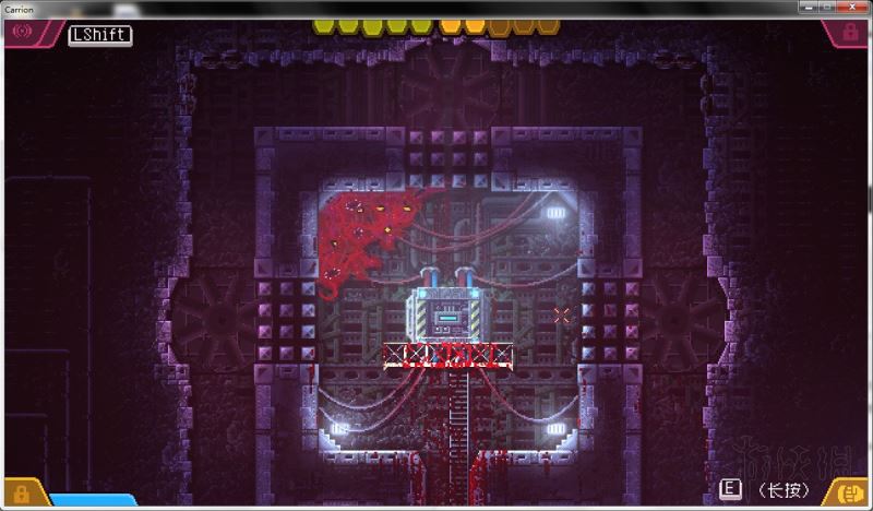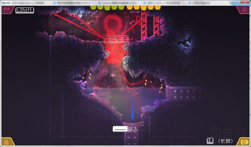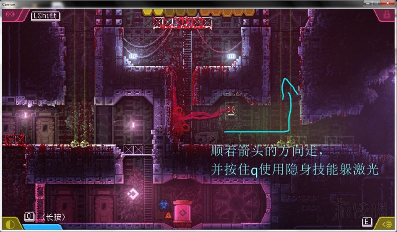 上面的门是厚铁门,红怪无法打开它。这扇门由激光控制,只要激光还是激活状态,它就会一直打开,相反就会关闭。