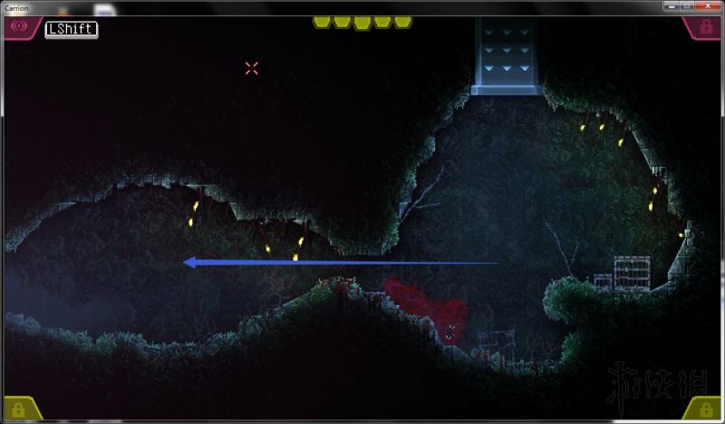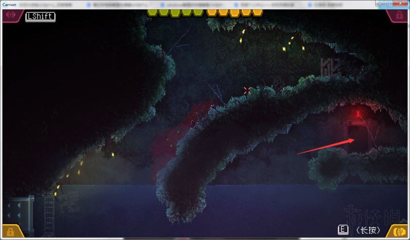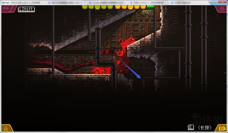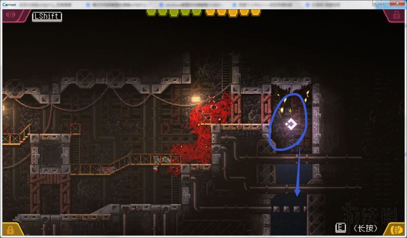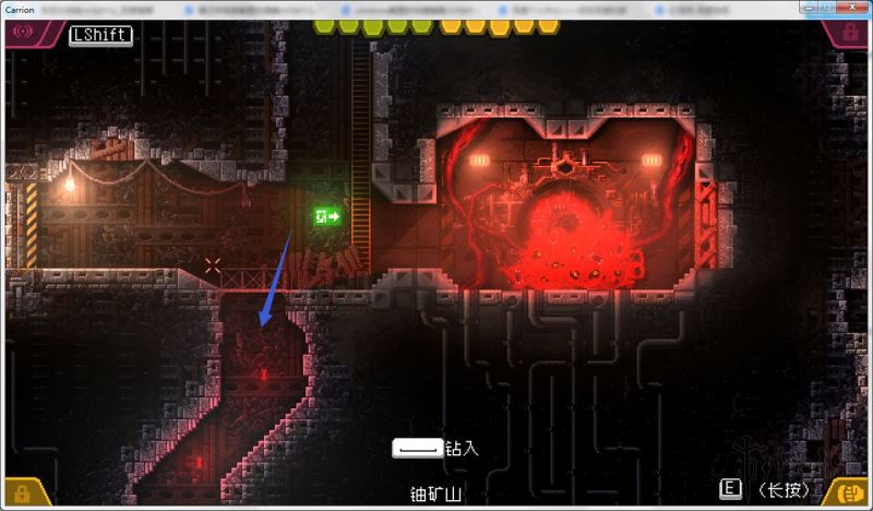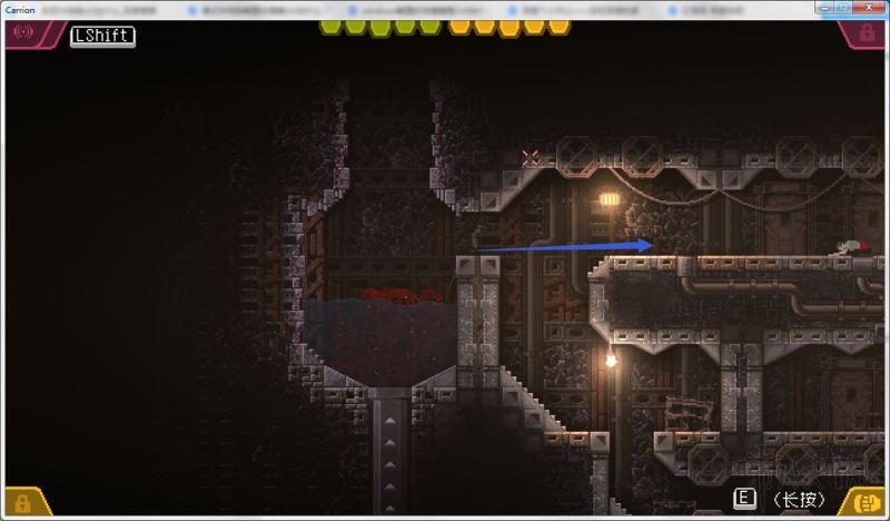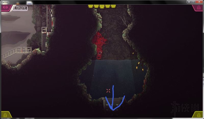 4、通过打开的路径进入下方房间,降落在管道旁的水中;前往该房间左侧,下到更下方的矿井房间。