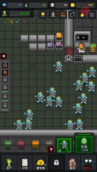 僵尸工厂手机版是一款休闲模拟养成游戏,该游戏集放置+合成+策略等元素于一体,在画面上延续经典的像素风格,类似于成长士兵、特雷特勒特拉等游戏,但在玩法却改变了往常的人类大战僵尸思路,从而转变为制造僵尸,玩家可将生产出的僵尸用于参加狩猎活动,通过攻击人类所产生的金币可以用来研究僵尸病毒,加速僵尸生产过程的时间消耗,或者提升僵尸属性,包括伤害、体力、移动速度等。