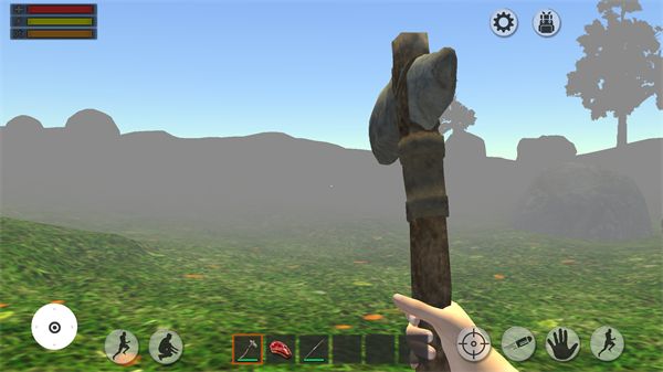 1、游戏的玩法与同类沙盒游戏的玩法大致相同,首次进入游戏背包内只有石斧、肉以及长矛这些简单的物品。
