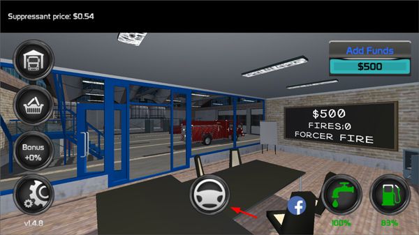 1、玩家打开消防车模拟器游戏,进入游戏主页面,在该页面中玩家可以查看消防车的油量、水量和设置等,玩家点击方向盘开始游戏;