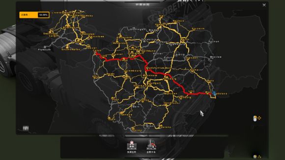 关于老家的选址,个人推荐一开始的老家选在德国中部。如法兰克福什么的(我选的伦敦,老早就后悔了……)原因是这里交通四通八达都是很宽的高速,这样一来游戏前期的难度会比较低。到了后期,有几个重工业城市给的任务报酬很高。包括英国的利物浦、格拉斯哥(Glasgow)、捷克的布拉迪斯拉瓦(Bratislava)奥地利的林茨(Linz)等等,都是很好的仓库选择。在选择任务后,可以在世界地图上看到导航显示的红色任务路线,这条路线是两地间的最短距离。这里要说的是,导航给的路线不一定是最优的!!!有时候走高速多绕个几十公里,比跑乡间小道划算得多!!!