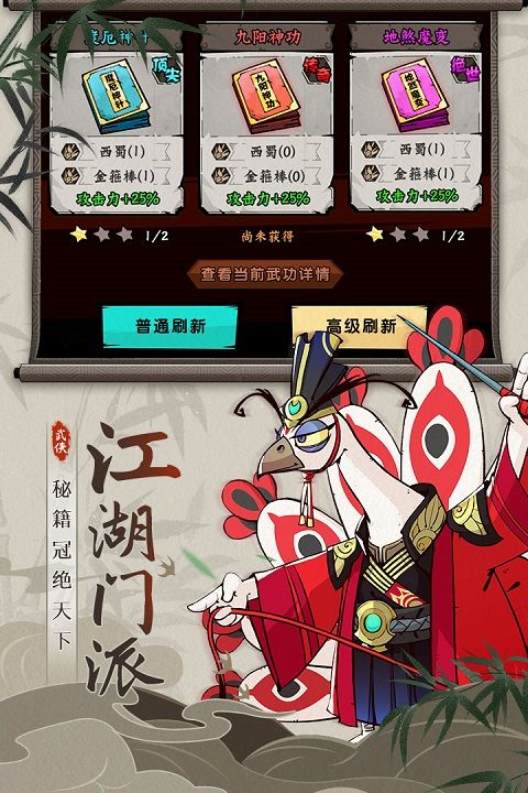 独具创新的秘籍修炼玩法:64本武功绝学,5种品质,14大门派,10大职业;任意组合门派,职业,可搭配出不同的武学秘技。