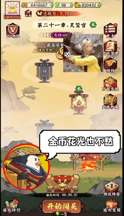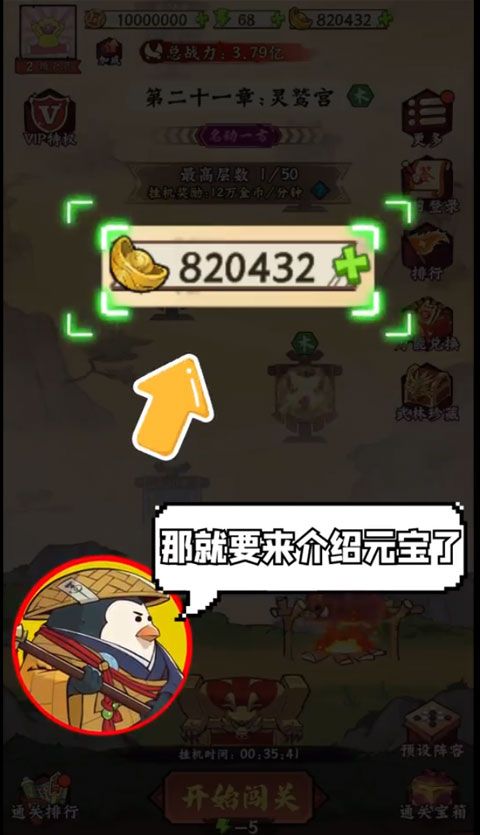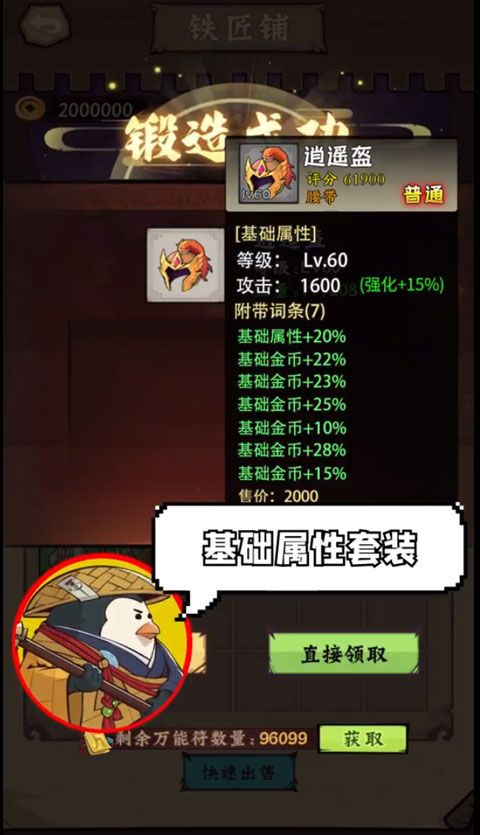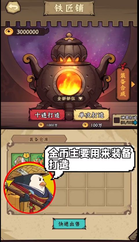 4、金币主要是用来装备打造,与与装备合成,前期建议,优先用金币打造三套装备:基础属性套装、挂机金币加成套装、闯关金币加成套装。凑齐了这几套装备之后,金币花光也不愁,金币积攒起来之后,就能用来升级武功。