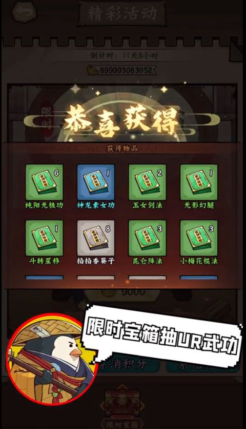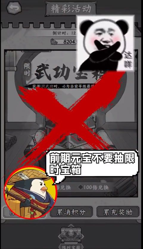 玩家前期一定不要用元宝抽限时宝箱这里只会抽到重复的UR武功或灵宠。