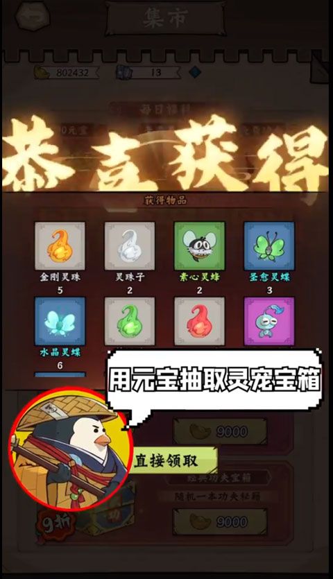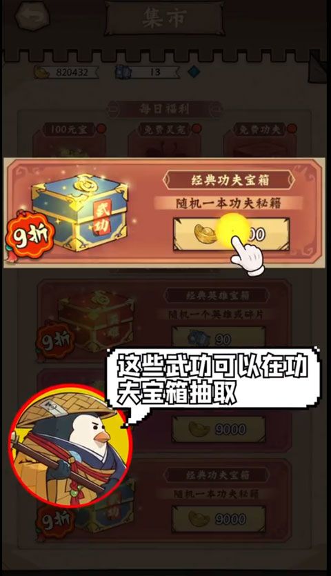 6、元宝首先用来收集全部的武功,这些武功可以在功夫宝箱抽取,或者在武林珍藏中获得,把64本秘籍全收集后,用元宝抽取灵宠宝箱。