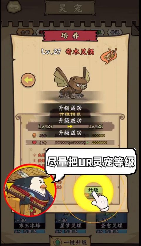 7、最后升级灵宠,尽量把UR灵宠等级拉到10级解锁全天赋,完成上面的养成,最后就可以来限时宝箱抽UR武功或者灵宠,加速提升战力。