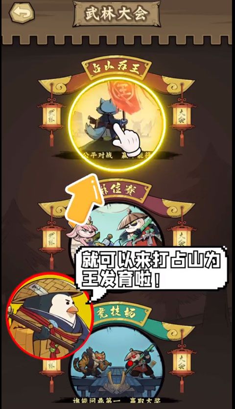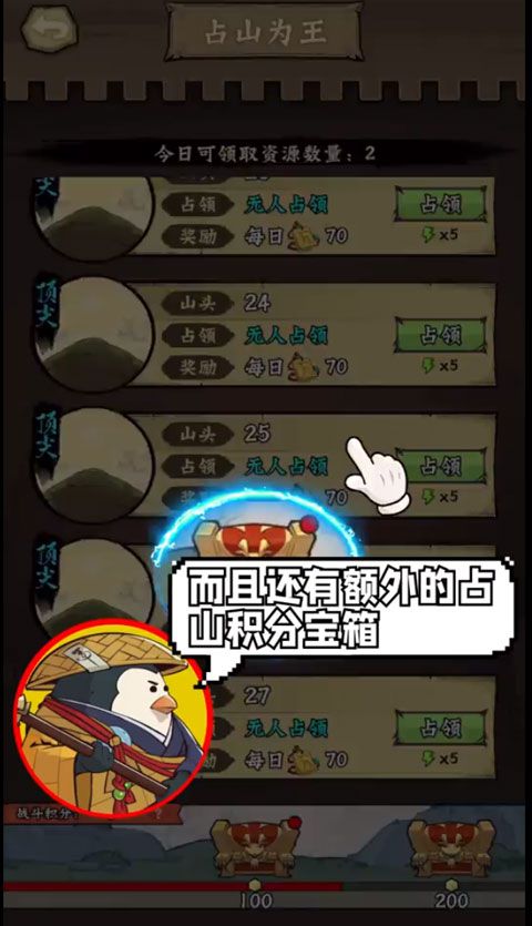 3、这时候就可以来打占山为王进行发育,占山为王的收益,不仅与扫荡闯关相同,而且还和额外的占山积分宝箱可以获得。
