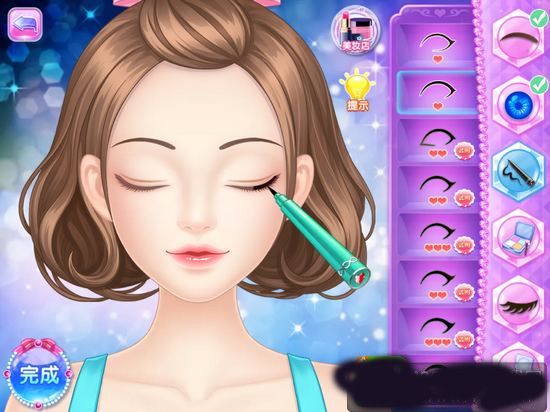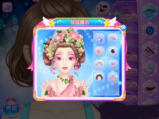 2、进入化妆状态,在右侧依次在众多方面进行化妆。注意有一些化妆是需要拖动工具到主角脸上涂抹, 并且出现涂抹完毕的信号才算化妆成功,否则是无效的化妆。