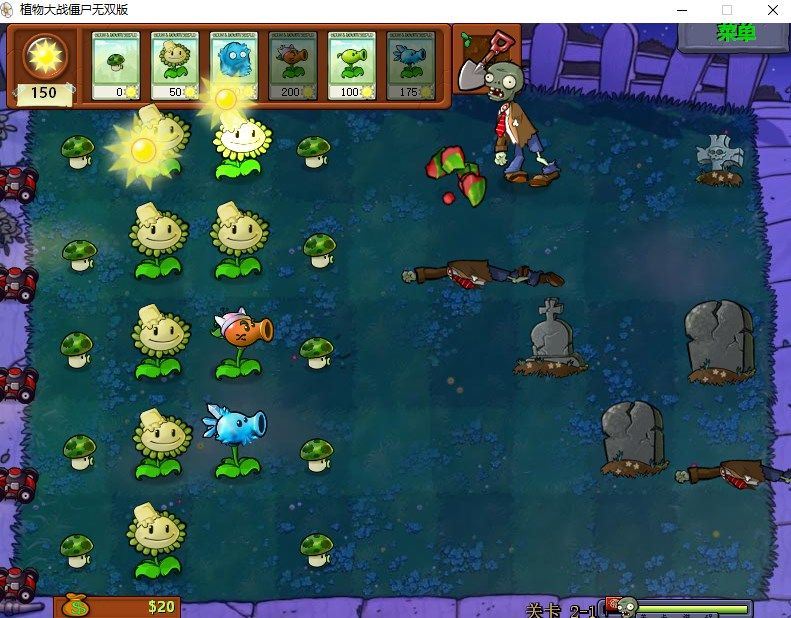 出怪较多情况,如下图需要多花50补倒数第二个大蒜,导致阳光不够(原本这里应该有150阳光)这里2路极限