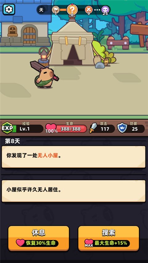 游戏中玩家们就与卡皮巴拉一起共同冒险探索度过每一天,每进入另一天即将随机刷新遇见各种事件,有敌人有幸运事件,从中玩家可以学习各种属性技能或获取相应数值,当然每一次处理事件后会损失生命值,当生命值为0代表本次冒险结束,并根据你的生存天数获得金币,金币可帮助你升级技能。