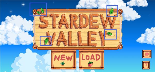 2、在游戏标题界面,可以看到英文标题的"左上"、"左下"、"右上"、"右下"四个角都有叶子。