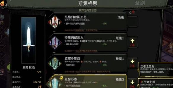 在有了初步技能点之后,游戏的玩法也就基本明朗了。给敌人挂上炼狱之魂(增伤50%),并且尽量保持身上有两种诅咒状态(增伤50%)的情况下尽量输出。游戏有五个主动祝福槽位,分别对应普通攻击(Attack),特殊攻击(Special),投掷炼狱之魂(Cast),冲刺(Dash),神之怒(Wrath);以及无上限的被动祝福槽位。如果某类祝福需要被激活(生命地狱XX时触发),那么祝福激活时会有屏幕模糊特效,并且会高亮该祝福。