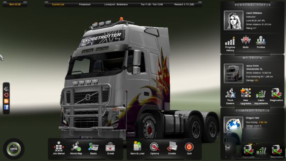 玩家进入游戏,建好人物即可看到主界面,游戏的各个界面的功能很直观很好掌握,我只挑一些各童鞋们提问多的着重讲一下。这张图上是我最近在开的“新欢”,沃尔沃的FH16。之前开过依维柯和奔驰,都已经丢给小弟了。
