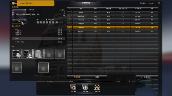 关于老家的选址,个人推荐一开始的老家选在德国中部。如法兰克福什么的(我选的伦敦,老早就后悔了……)原因是这里交通四通八达都是很宽的高速,这样一来游戏前期的难度会比较低。到了后期,有几个重工业城市给的任务报酬很高。包括英国的利物浦、格拉斯哥(Glasgow)、捷克的布拉迪斯拉瓦(Bratislava)奥地利的林茨(Linz)等等,都是很好的仓库选择。在选择任务后,可以在世界地图上看到导航显示的红色任务路线,这条路线是两地间的最短距离。这里要说的是,导航给的路线不一定是最优的!!!有时候走高速多绕个几十公里,比跑乡间小道划算得多!!!