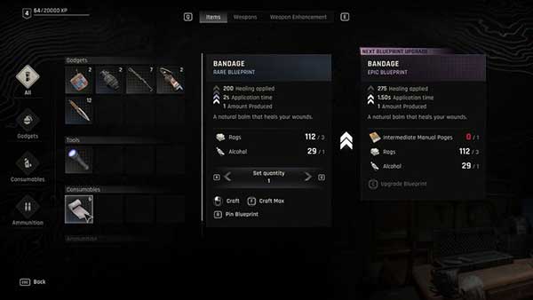 你应该在寻找重型背心和裤子的两个黑暗地带中捡到了一些手册页。使用它们来升级你的绷带蓝图,以增加其治疗量和使用速度。
