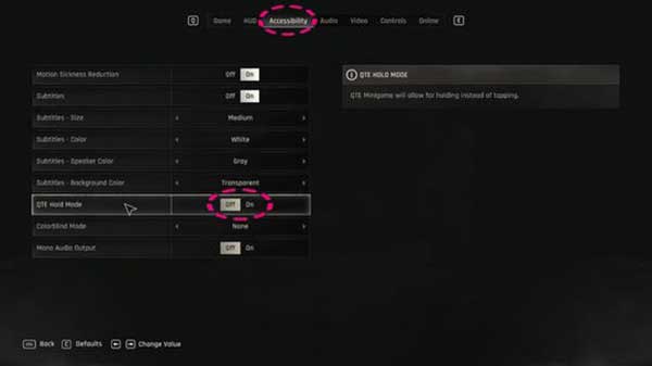 这是一个快速反应事件(QTE)。如果你在开始新游戏时没有将设置从“点击”改为“按住”,你可以从设置菜单中更改。打开主菜单,导航至“选项”。选择“辅助功能”标签页,并将“QTE按住模式”(QTE Hold Mode)设置为开启(On)。保存更改使其生效。