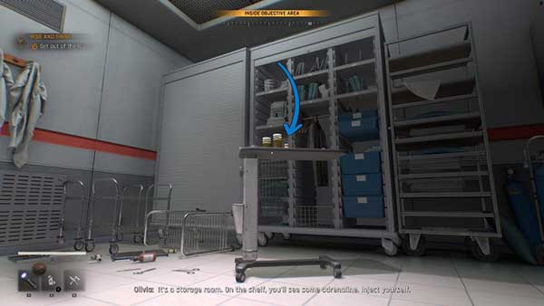 在储物柜前的移动推车上,你会找到所提到的肾上腺素注射器。与之互动开始过场动画。动画结束后,你将能够行走并探索周围环境。你可以在这个房间里拾取一包香烟,这是可向商人出售的有价值物品。