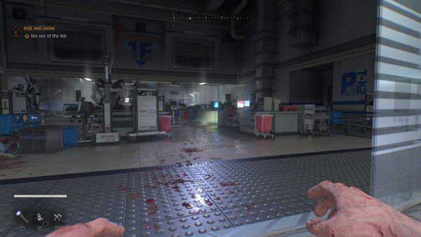 开始时,蹲下并跟随地板上手电筒发出的锥形光束。从桌子底下爬过去,跟随血迹到达手术区的另一侧,走到有桌子位置的帘子后面。为了出门,你需要在两个正在咀嚼的感染者之间潜行穿过。