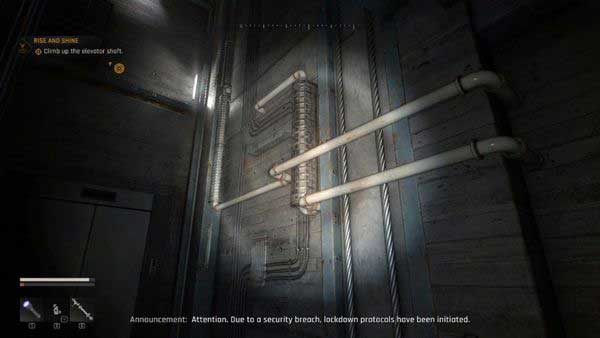 如果事情这么简单就好了。有人非常想把克兰留在设施内,于是锁定了电梯。奥利维亚也抛弃了你,留下你独自寻找出路。过场动画结束后,你将身处电梯井,需要爬完剩下的路。