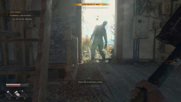 此时你会收到指示,学习如何从背后偷袭敌人。最简单的方法是蹲下,沿着该区域的左侧移动,走到公告板后面。潜行到感染者身后并触发偷袭。