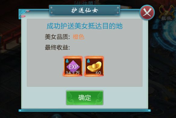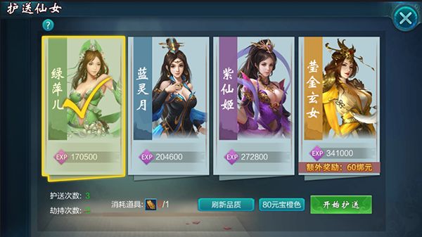 2.玩家前往吉祥天场景内移动到护送NPC处,通过使用护送令刷新品质的方式,可护送不同品质的美女,品质越高奖励越好,刷出橙色品质还可获得额外绑定元宝奖励;