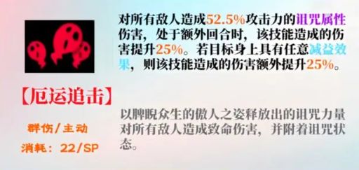 1、对敌方全体目标造成诅咒属性伤害,若该技能在额外回合释放时,提升技能伤害。