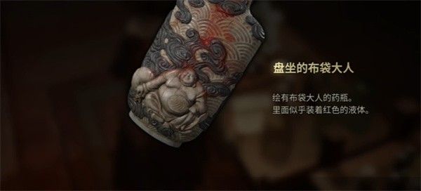 在寺庙桌子上可见一个药瓶,即【盘坐的布袋大人】,绘有布袋大人的药瓶,瓶内盛有红色液体。