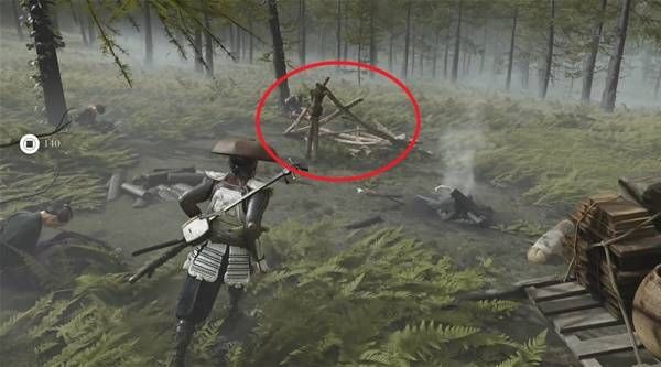 走过来找到一个废弃营地,在几个木叉子上拿到这个斗笠。