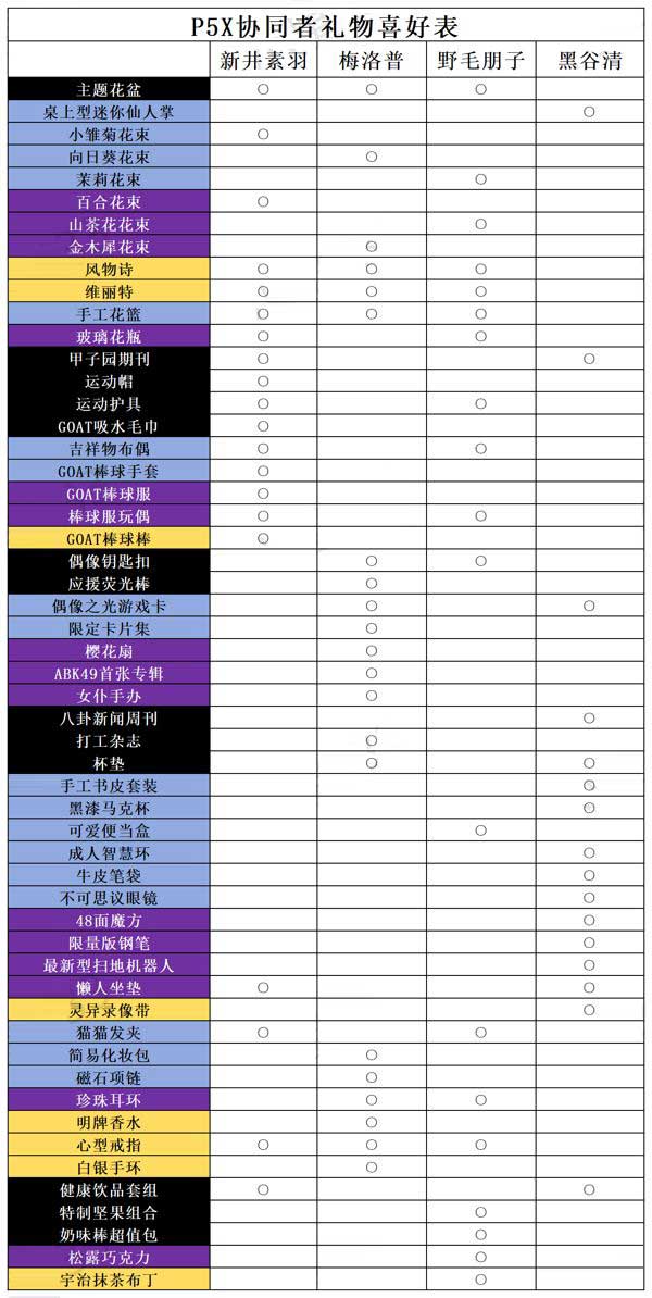 以上就是小编整理带来的女神异闻录夜幕魅影协同者礼物喜好表,p5x角色礼物喜好大全介绍,感兴趣的玩家快来下载体验这款游戏吧!