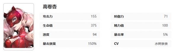 女神异闻录:夜幕魅影高卷杏怎么样?高卷杏是女神异闻录中的5星角色,初始人格面具是「卡门」,那么高卷杏在夜幕魅影中有着什么样的技能,意识又有哪些加成呢?接下来就让我们一起了解一下吧。