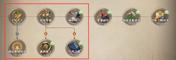 其次,我在说说大学研究。我们要优先研究爵位要求你升的,然后升工坊和贸易相关研究,英雄等级统兵>骆驼整备、通商惠工、经商之道>人口研究>重步研究>重装兵法>战戟研究>战戟兵法,其中税收研究,最好跟你下面三个技术同步升级,不要猛猛升税收,很鸡肋。