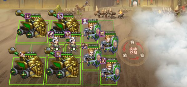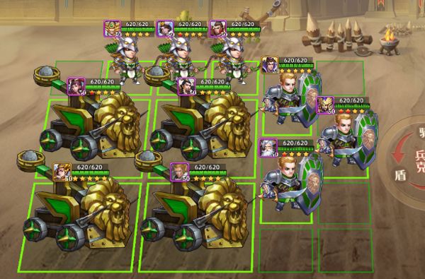 具体配置为,前排三到四个重装,后排使用当前自身能上阵的最强后排输出兵种。不需要上满五个前排,前排只需要扛得住就行,日常任务中,扛得住就少上前排,后排输出足够就能减少损伤,具体排兵布阵如下图所示: