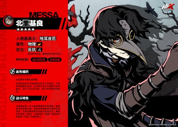 「北里基良」是一位五星物理属性反抗角色,他拥有两种截然不同的攻击形态,分别有着独特的技能与攻击方式,拥有特有机制【流血】,同时也具备刷新【流血】持续时间和结算【流血】伤害的能力。