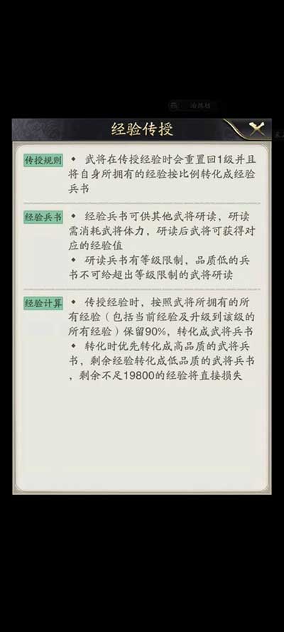 兵书全称是经验兵书,兵书最大的作用就是可以让新武将直接提升大量等级,兵书的品质越高,蕴藏的经验也就越多。目前可以获得兵书的途径只有重置武将这一个途径,选中一个武将,点击传授按键就可以把该武将的所有经验保存为经验兵书了,该武将回到一级。