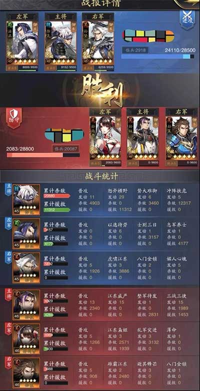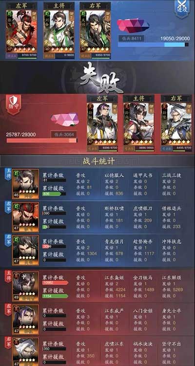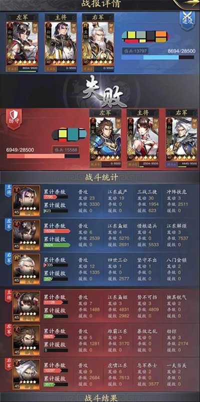 三孙队伍有一定红度技能配置比较奢华,比如反戈一击劫掠等都是S级技能。输了的原因在于:1.孙策武力属性不是很强,劫掠和暴敛之乱没有打出较高的伤害;2.孙尚香比较脸黑被对面的孙尚香爆头;3.孙坚的技能有点尴尬,反戈一击受到武力伤害叠加层数,孙坚江东猛虎带有两次守御会抵挡伤害,其次息军养士大量恢复兵力无法打到反击临界点,兵力的40%;4.对面有减伤和破防,这一战报主要是为了说明孙尚香【江东解烦】打骑兵的效果,一发技能将近5000伤害